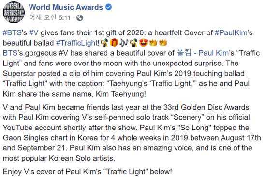 지난 19일 월드뮤직어워드는 공식 페이스북에 지난 18일 뷔가 방탄소년단 공식 트위터에 폴킴의 '초록빛' 커버 영상을 올린 소식을 전하며 비하인트 스토리까지 풀었다.