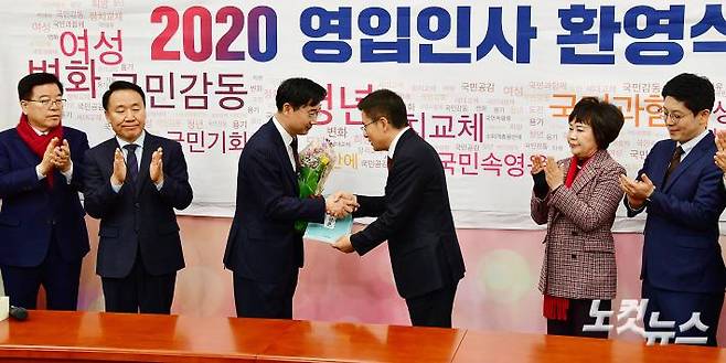 자유한국당 황교안 대표가 21일 오전 국회에서 열린 2020 영입인사 환영식에서 영입인재 5호 신범철 전 아산정책연구원 안보통일센터장에게 꽃다발과 민평론 책자를 전달하고 있다.