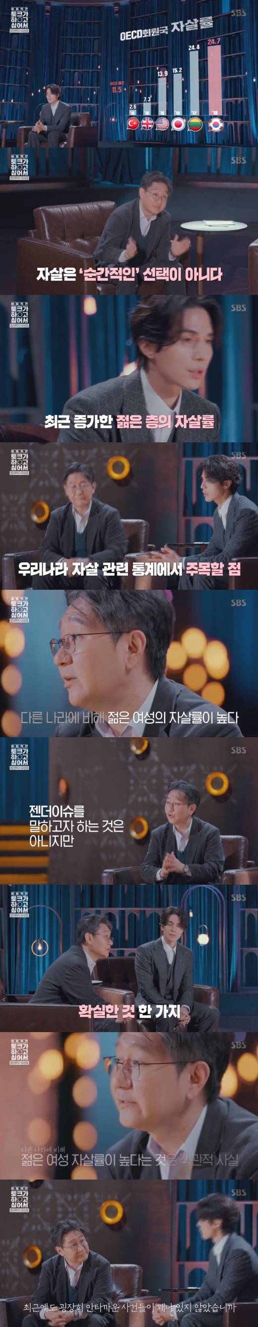 특히 그는 "다른 나라에 비해 상대적으로 여성이 높다. 여러 가지를 생각해볼 수 있을 거다. 자칫하면 젠더 이슈로 비칠질까 두렵지만, 확실한 건 스스로를 불행하게 여기는 세대가 분명히 존재한다는 것이다. 이를 객관적 사실로 이해해야 하지 않나 싶다. 최근에도 안타까운 일이 많지 않았다"라고 전했다.