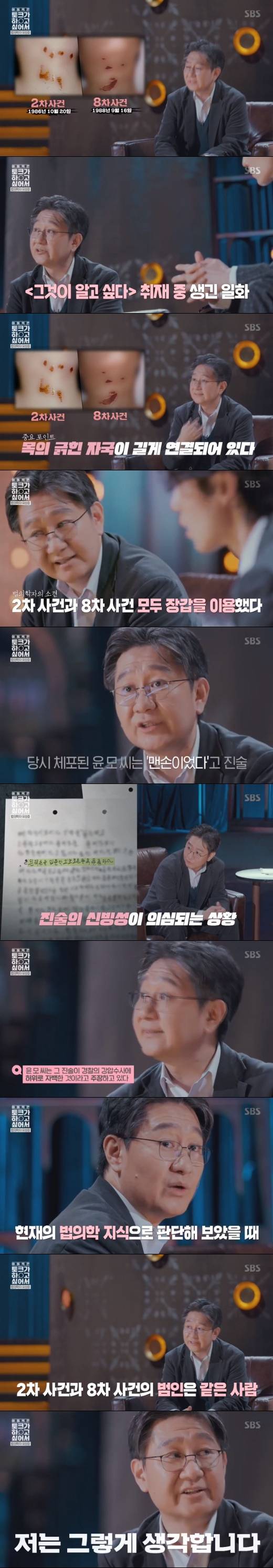 그는 "2차 사건과 8차 사건 모두 '장갑'을 이용했다. 동일했다. 그런데, 억울하게 투옥됐다고 알려진 분은 '맨손'이었다고 진술이 되어 있더라. 장갑이 아닌 맨손, 그 당시 수사기관이 이걸 왜 인정했는지 궁금하다. 왜 누가 아무도 잡아내지 않았을까 의문이다"라고 말했다.