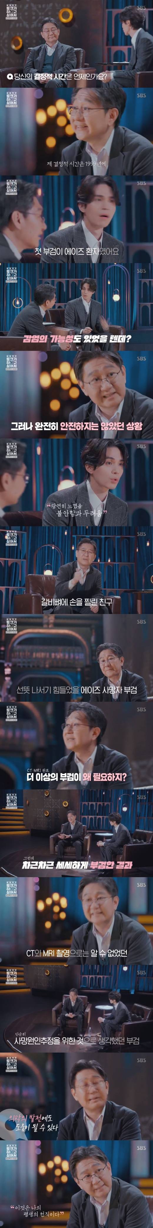 이어 그는 "에이즈 부검을 자원한 것까진 좋았는데, 그 당시 저도 'CT·MRI까지 찍었는데 왜 부검을 하지?'라는 의구심을 품고 있었다. 그런데 부검한 결과를 분석해보니 CT나 MRI에서 나오지 않는 새로운 의학적 사실을 알아냈다는 거다. 저와 커뮤니케이션을 하던 다른 분들도 배워가는 게 있더라. 그때 정말 놀랐다. 부검을 통해 새로운 의학의 발전, 이런 걸 이뤄낼 수 있겠구나 싶어 놀라웠다. 그래서 그때 '이 직업을 내가 평생 천직으로 삼아야겠다' 하는 생각을 처음으로 하게 된 거다"라고 얘기했다.