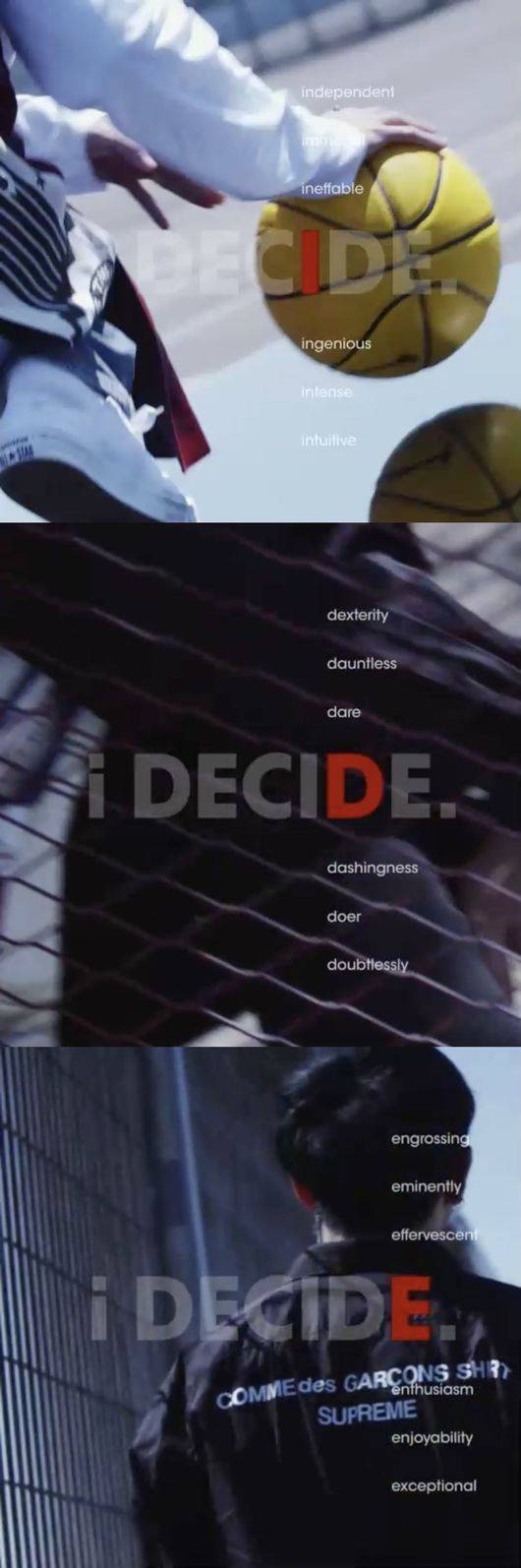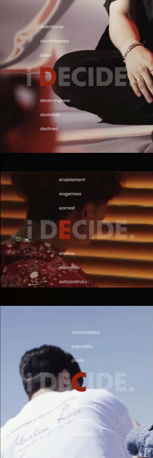 영상은 아이콘의 새 앨범명 'i DECIDE' 철자가 새겨진 붉은색 띠로 시작돼 강렬한 인상을 준다. 이어 'i DECIDE'의 각 알파벳을 대표하는 영단어들이 순차적으로 나타났다.