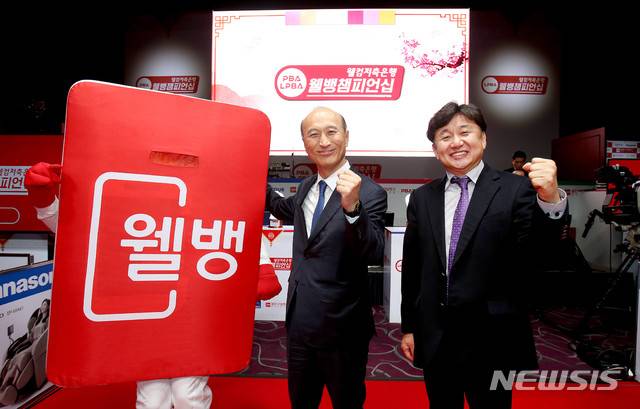 [서울=뉴시스] 박민석 기자 = 장상진(오른쪽) PBA 부총재와 김대웅 웰컴저축은행 대표가 23일 오후 경기 고양시의 한 호텔에서 열린 PBA투어 7차전 '웰컴저축은행 웰뱅 PBA-LPBA 챔피언십 대회' 개막식에 참석해 기념촬영을 하고 있다. (사진=PGA투어 제공) 2020.01.23.