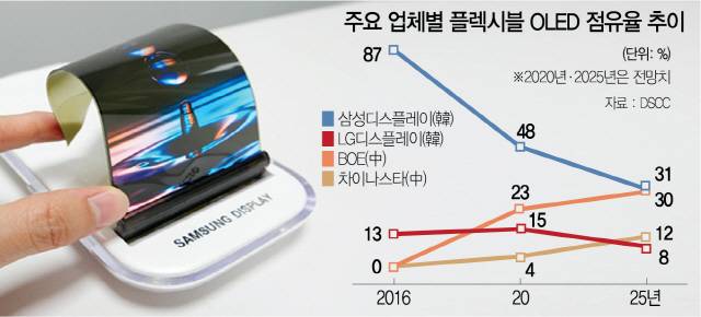 24일 시장조사기관 DSCC에 따르면 지난해 플렉시블 OLED 시장에서 점유율 기준 1위는 삼성디스플레이(60%)가 차지했으며 이어 LG디스플레이(034220)(16%), BOE(15%), 비전옥스(3%), 차이나스타(2%) 순이었다. 이 같은 판도는 올해부터 급변할 것으로 전망된다. BOE가 23%의 점유율로 LG디스플레이(15%)를 넘어설 것으로 예상되며 과반의 점유율을 자랑하던 삼성디스플레이는 사상 처음으로 점유율이 48%까지 떨어질 것으로 보인다. 특히 오는 2022년에는 BOE(28%), 비전옥스(11%), 차이나스타(10%), 티앤마(4%) 등 중국 업체들의 점유율 합이 삼성디스플레이(33%)·LG디스플레이(11%) 등 한국 업체 점유율 합을 사상 처음으로 뛰어넘을 것으로 분석된다. 2025년에는 BOE(30%)와 차이나스타(12%)의 합산 점유율만으로도 삼성디스플레이(31%)와 LG디스플레이(8%)의 합산 점유율을 넘어설 것으로 분석돼 디스플레이 시장에서도 확실한 ‘차이나 굴기’를 보여줄 것으로 예상된다.