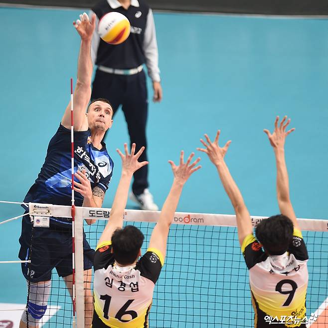 [엑스포츠뉴스 안산, 김한준 기자] 24일 오후 경기도 안산 상록수체육관에서 열린 '도드람 2019-2020 V리그' 남자부 OK저축은행과 한국전력의 경기, 한국전력 가빈이 공격을 시도하고 있다.