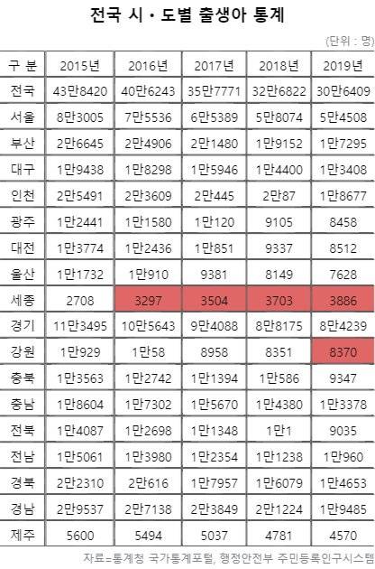통계청 국가통계포털(KOSIS)과 행정안전부 주민등록인구시스템(RIUS) 통계를 분석한 결과 이 기간 한 번이라도 출생아 수가 전년보다 많았던 적이 있는 지역은 강원도와 세종시뿐이었다. 세종시의 경우 행정중심복합도시로 인구가 꾸준히 증가하고 있는 점을 고려하면 사실상 출생아가 늘어난 건 강원도가 유일하다.
