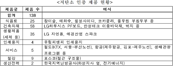 지난해 12월 기준으로 43개 기업 138개 제품(서비스 포함)이 환경부 산하 기관인 한국환경산업기술원을 통해 '저탄소 인증'을 받았다.