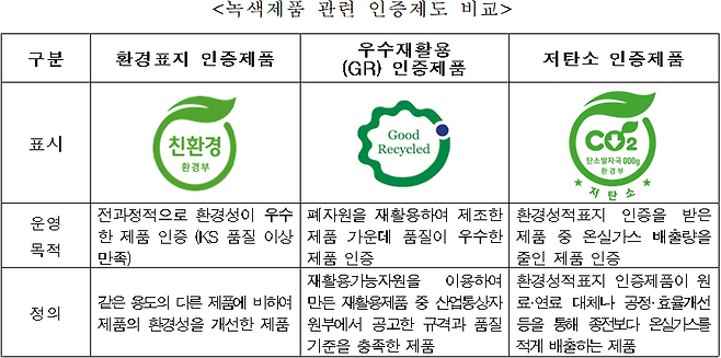 녹색제품은 에너지·자원의 투입과 온실가스 및 오염물질의 발생을 최소화하는 제품으로 '환경표지 인증제품'과 '우수재활용 인증제품'으로 구성되어 있다. 이번 개정법률에 따라 '저탄소 인증제품'도 녹색제품에 포함되는 것이다.