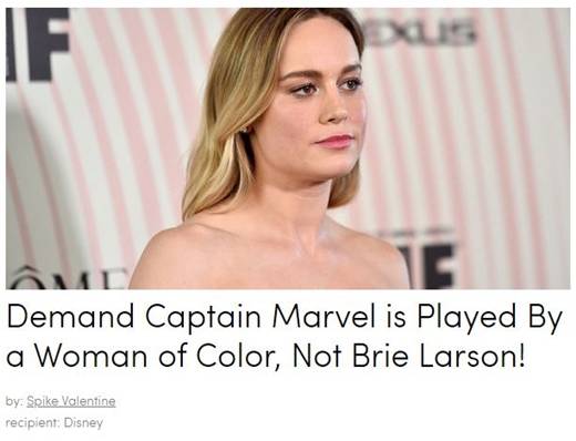 27일(현지시간) 미국의 청원사이트에 따르면, 청원자 스파이크 발렌타인은 “동성애자 흑인 여성이 캡틴 마블 역할을 수행하도록 하기 위해 브리 라슨이 물러나야한다”고 주장했다.