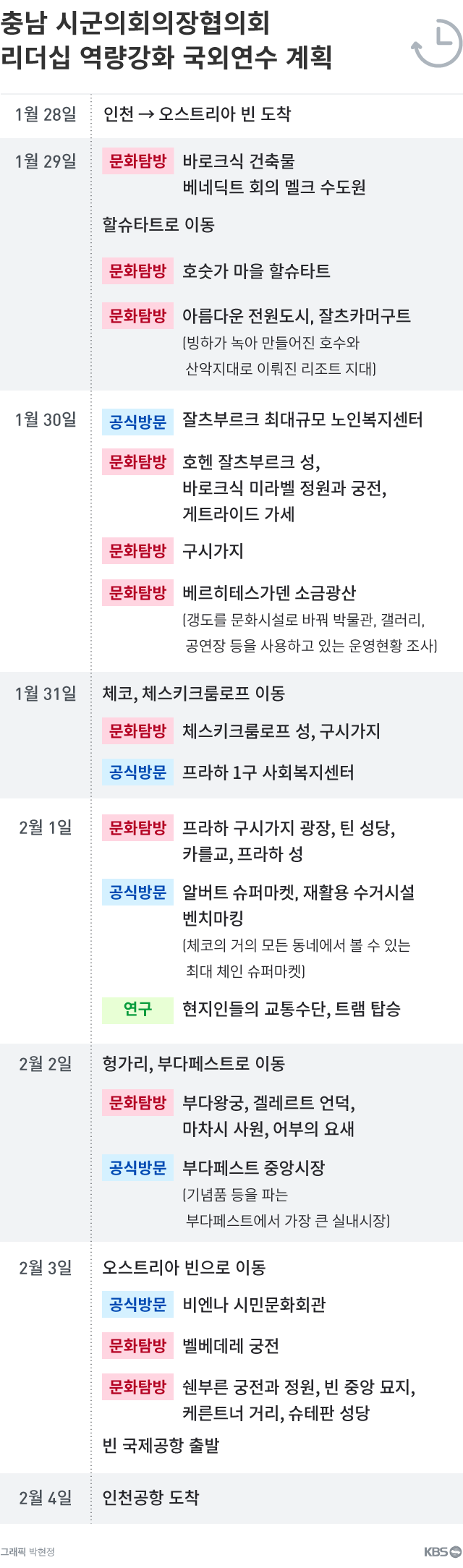 충청남도 시·군 기초의회 의장들의 단체인 '충남시군의회의장협의회'가 동유럽 3개국으로 '리더십 역량 강화' 국외 연수를 떠났습니다. 연수 대상자는 충남지역 15개 시군 가운데 13개 시군(천안시, 금산군 제외)의 기초의장 13명과 수행원들을 포함해 모두 20여 명입니다. 이들은 어제(28일) 오후 인천공항을 출발해 오늘(29일) 오스트리아 빈에 도착했습니다. 앞으로 7박 9일간 오스트리아, 체코, 헝가리 등지에서 연수를 진행합니다. 연수 계획엔 어떤 것들이 포함됐을까요?