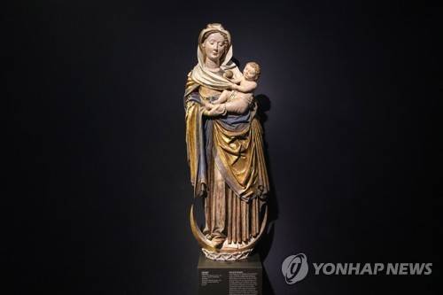 epa08175578 Artwork 'Virgin Mary' is displayed during a press preview of the exhibit 'Gods in Color Golden Edition: Polychromy of Antiquity' at Liebieghaus museum in Frankfurt Main, Germany, 29 January 2020. The exhibition will be opened for the public from 30 January to 30 August 2020. EPA/ARMANDO BABANI