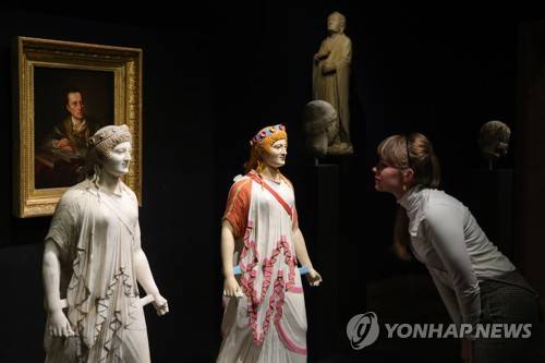 epa08175581 A member of the press looks at the artwork 'Statue of Artemis' during a press preview of the exhibit 'Gods in Color Golden Edition: Polychromy of Antiquity' at Liebieghaus museum in Frankfurt Main, Germany, 29 January 2020. The exhibition will be opened for the public from 30 January to 30 August 2020. EPA/ARMANDO BABANI