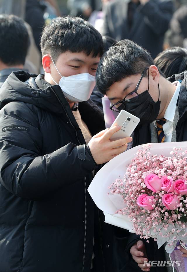 [전주=뉴시스] 김얼 기자= 전북 전주시 전주신흥고등학교 졸업식이 열린 30일 전주신흥고등학교 강당 입구에서 학생들이 우한 폐렴(신종 코로나바이러스 감염증)의 확산을 방지하기 위해 마스크를 쓰고 있다. 2020.01.30.