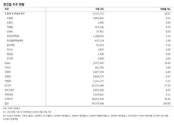 그는 "다만 조원태 회장 측이 지분율 격차를 줄이기 위해 노력할 것으로 판단한다"면서 "조원태 회장이 30.46%의 지분을 갖고 있는 소액주주들로부터 지분 17.76%를 포섭하는데 성공할 경우 발행주식의 과반을 확보할 수 있다. 이 경우 KB증권은 한진그룹의 경영권 분쟁상황이 대한항공의 주주가치 제고에 긍정적이라는 의견을 유지한다"고 말했다.