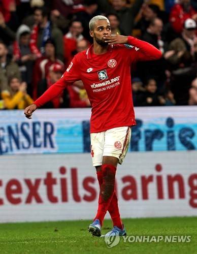 epa08185134 Mainz?s Jerry St. Juste celebrates his first goal during the German Bundesliga soccer match between 1. FSV Mainz 05 and FC Bayern Munich in Mainz, Germany, 01 February 2020. EPA/HASAN BRATIC CONDITIONS - ATTENTION: The DFL regulations prohibit any use of photographs as image sequences and/or quasi-video.