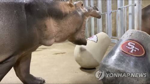 This still image taken from video provided by WLWT News 5 Cincinnati shows Fiona the hippopotamus at the Cincinnati Zoo on Thursday, Jan. 30, 2020 in Cincinnati. Zoo keepers on Thursday placed two “enrichment” toys in front of her, marked with the logos of the Kansas City Chiefs and the San Francisco 49ers. While the plan called for Fiona to nudge one of the items with her snout to indicate her pick, she instead thew up her choice for Sunday's Super Bowl on the Chiefs' item, WLWT-TV reports. (WLWT News 5 Cincinnati via AP)
