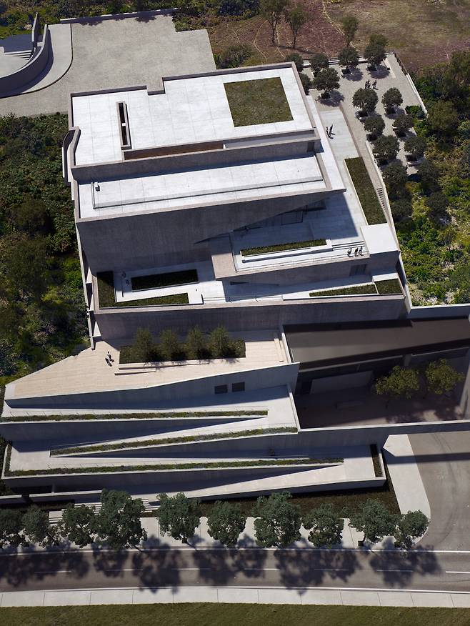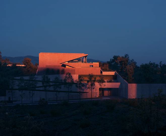 The two main public spaces of the project are carefully linked to the site strategy. The main lobby, facing the university, is defined by gestures that echo the project's quiet response to the campus and enhance a sense of interiority. To the north of the Skylight Hall, the public exhibition space incorporates a striking sloped ceiling that extends the cut on the facade, connects to the exterior public terraces, and enjoys dramatic views of the ocean and mountains beyond. >>Chief Architectural Designer Yichen Lu, Chief Interior Designer Yichen Lu, Qinwen Cai, Associate in Charge Qinwen Cai, Wen Zhu, 자료_ STUDIO LINK-ARC, Photos by Shengliang Su, 기사 출처_ 에이앤뉴스 건축디자인건설경제미디어뉴스 AN NEWS(ANN NEWS CENTER) 제공