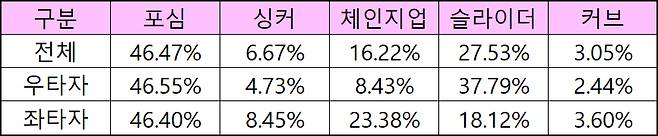 7시즌 정도를 치루며 구종들이 해마다 성적 편차가 났지만 두 구종은 구사비율에 큰 차이가 나타난 적은 없었다.