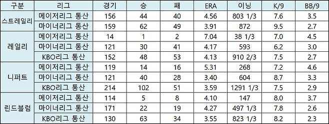 스트레일리는 메이저리그에서 시즌 10승을 세 차례나 해낸 투수로 빅리그에서만 선발로 140경기를 뛴 경험많은 베테랑 투수다. 여기에 커리어 평균자책점이 4.53으로 여전히 중하위권 선발로는 수요가 있을만한 커리어다. 지난해 불운과 부진으로 무너지긴 했지만(14G 9.82) KBO 이적을 예상하긴 어려웠던 투수였다.