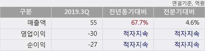 - 2019.3Q, 매출액 55억(+67.7%), 영업이익 -30억(적자지속)