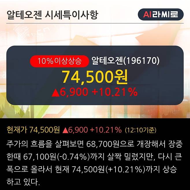 '알테오젠' 10% 이상 상승, 2019.3Q, 매출액 55억(+67.7%), 영업이익 -30억(적자지속)