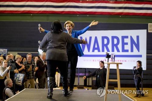 Democratic presidential candidate Sen. Elizabeth Warren, D-Mass., is greeted by Gloria Timmons as she arrives at a campaign stop at Nashua Community College, Wednesday, Feb. 5, 2020, in Nashua, N.H. (AP Photo/Andrew Harnik)