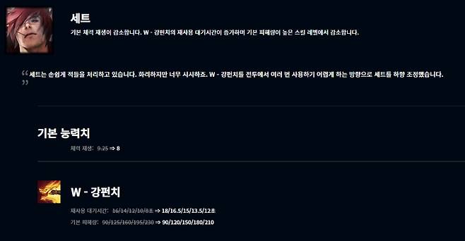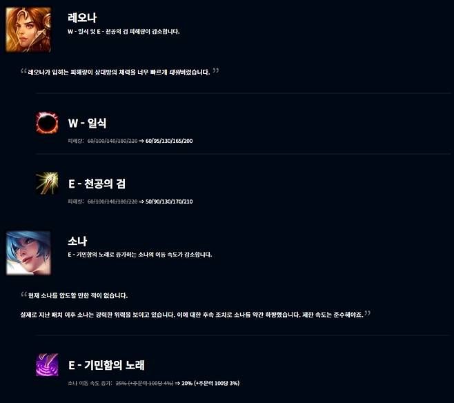 이외에 현재 서포터 1티어로 평가받는 레오나는 W스킬 일식의 피해량이 60/95/130/165/200으로, E스킬 천공의 검의 피해량이 50/90/130/170/210으로 줄어 화력이 약화됐다. 소나는 E스킬 기민함의 노래의 소나 이동 속도 증가 효과가 20%(+주문력 100당 3%)로 감소했다.