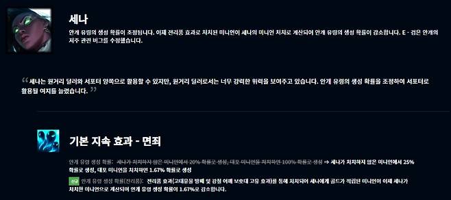 세나는 기본 지속 효과인 면죄의 안개 유령 생성 확률이 조정돼 원거리 딜러 대신 서포터로 활용될 여지를 높였다. 안개 유령의 생성 확률이 세나가 처치하지 않은 미니언에서 25%, 대포 미니언 처치 시 1.67%로 증가했다. 단 서포터 아이템의 전리품 효과로 세나에게 골드가 적립된 미니언이 세나가 처치한 미니언으로 계산돼 안개 유령 생성 확률이 1.67%로 감소한다.