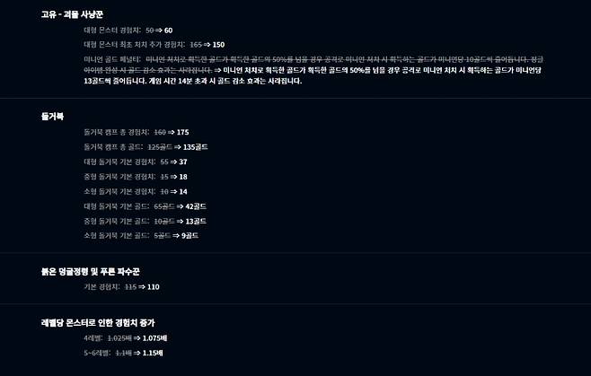 처치에 많은 시간이 소요되는 돌거북은 보상이 늘어났다. 각각의 돌거북 처치 시의 경험치와 골드가 소폭 증가해 캠프 총 경험치는 175로, 총 골드는 135골드로 늘어났다. 붉은 덩굴정령 및 푸른 파수꾼의 기본 경험치는 110으로 감소했다. 레벨 당 몬스터로 인한 경험치 증가량은 4레벨 때 1.075배로, 5에서 6레벨일 때 1.15배로 소폭 증가했다.