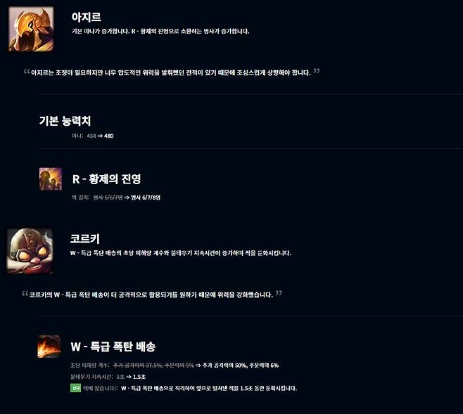 코르키는 W스킬 특급 폭탄 배송의 초당 피해량 계수가 추가 공격력의 50%, 주문력의 6%로 증가했고 불태우기 지속시간도 1.5초로 늘어났다. 또한 새로운 효과가 추가돼 W스킬로 직격하여 밀쳐낸 덕을 1.5초 동안 둔화시킨다.