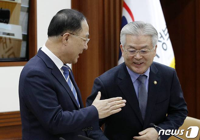 (서울=뉴스1) 안은나 기자 = 홍남기 경제부총리 겸 기획재정부 장관(왼쪽)이 7일 오전 서울 종로구 정부서울청사에서 열린 한·러 수교 30주년 기념사업 추진점검회의에서 김용삼 문화체육관광부 1차관의 악수 요청에 손인사로 답하고 있다. 2020.2.7/뉴스1