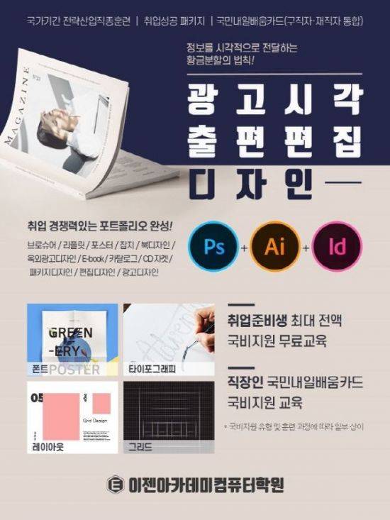 이젠아카데미컴퓨터학원, 광고시각·출판편집디자인 프로그램 포토샵·일러스트?인디자인 왜 중요할까? 취업률 우수한 국비 무료교육 추천