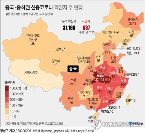 중국 국가위생건강위원회(위건위)는 7일 0시(현지시간) 기준 전국 31개 성에서 신종 코로나 누적 확진자는 3만1천116명, 사망자는 636명이라고 발표했다.