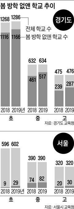 몇 년 새 방학 풍경이 완전히 바뀐 대표적인 지역이 경기도다. 경기도교육청에 따르면 2019학년도 기준 경기도 내 초등학교 91%(1286교 중 1166교), 중학교 82%(634교 중 517교), 고등학교 60%(476교 중 287교)가 2월 봄방학을 없앴다.