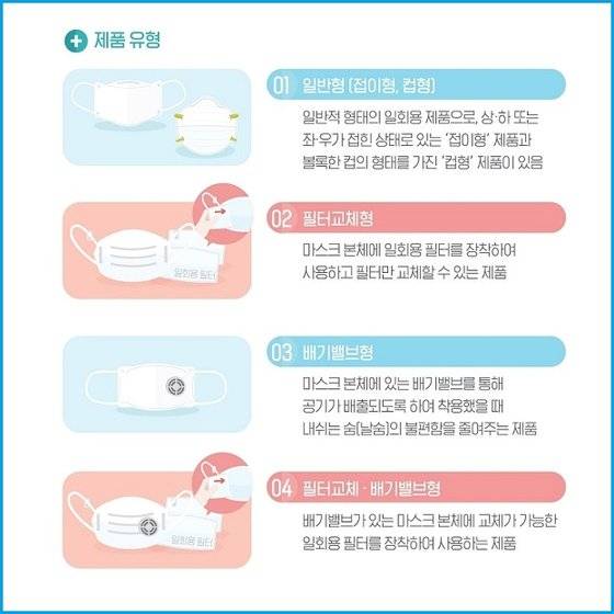 보건형 마스크는 모양에 따라 상하·좌우가 접힌 접이형, 볼록한 컵 형태의 컵형, 마스크 본체에 일회용 필터를 장착해 사용하고 필터만 교체할 수 있는 필터교체형, 공기가 배출될 수 있게 마스크 본체에 배기밸브를 달아 숨쉬기 편하게 한 배기밸브형, 배기밸브가 있는 마스크 본체에 교체 가능한 일회용 필터를 장착한 필터교체&배기밸브형으로 나뉜다.