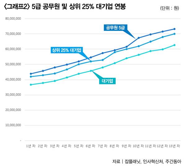 이렇게 산출한 공무원의 연차별 연봉을 민간기업의 연차별 연봉과 비교했다(그래프1 참조). 1년 차부터 13년 차까지 줄곧 가장 많은 연봉을 받는 '일자리'는 대기업이 아닌 5급 공무원. 5급 공무원 연봉은 1년 차 때 대기업보다 740만 원 많은데, 이 차이는 갈수록 벌어져 13년 차 때 1170만 원에 달한다. 5급 공무원 연봉은 '상위 25% 대기업'과 비교해도 항상 높다(그래프2 참조).
