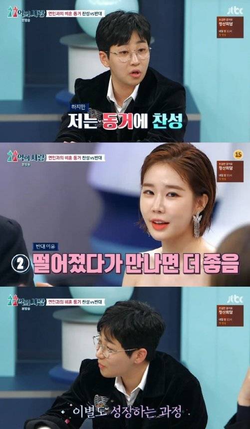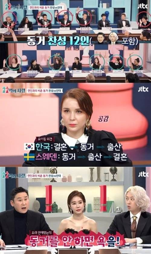연인과의 비혼 동거에 대해 찬반 토론도 진행됐다. MC 신동엽, 김희철을 포함해 12명의 패널들이 '찬성'에 손을 들었고, 실제 동거 경험이 있는 남자 패널 3명 포함 6인의 패널이 반대 의견을 냈다.