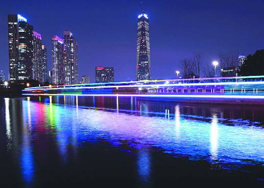 인천 송도 센트럴파크에서 유람선의 LED 조명이 호수를 수놓고 있다. 지난 9일 코마린 웨스트보트하우스에서 출발한 배가 남긴 빛의 흔적을 45초 동안 카메라에 담았다.