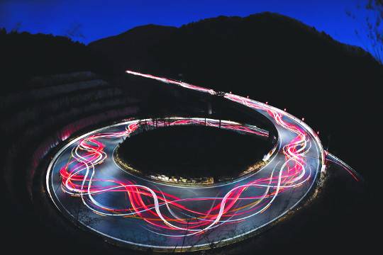강원도 춘천 명지령을 차들이 넘어가고 있다. 지난달 24일 인적이 드문 이곳에서 자동차가 지그재그 운전을 했다. 5분가량 카메라에 담은 자동차의 궤적은 한 송이 꽃처럼 보인다.