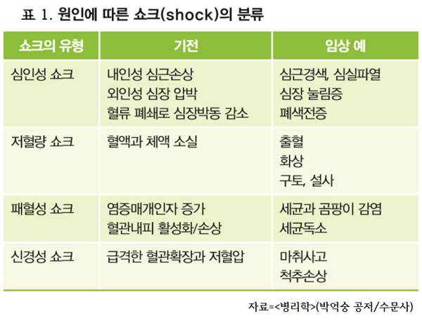쇼크는 원인에 따라 심장 문제인 ‘심인성’, 체액과 혈액 부족 때문인 ‘저혈량성’, 세균 감염에 의한 ‘패혈성’, ‘신경성’ 쇼크로 분류할 수 있고, 진행 순서에 따라 ‘비진행’, ‘진행’ 그리고 ‘회복 불능’ 단계로 구분할 수 있다.