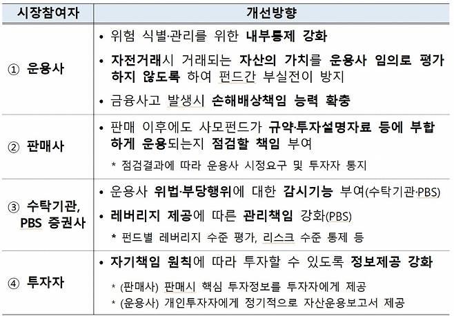 TRS 관리도 강화된다. 라임운용처럼 PBS 계약을 체결하지 않은 증권사로부터 TRS를 통해 레버리지를 일으키는 것이 전면 금지된다. 정식으로 PBS 계약을 맺은 증권사만 TRS를 제공할 수 있다는 얘기다. TRS 레버리지 한도도 현행 사모펀드 레버리지 한도인 400% 안에 포함되도록 명확히 규정된다.