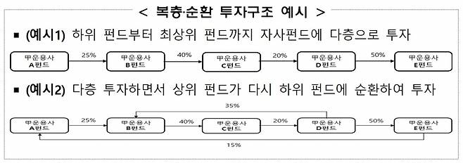 금융위는 '모→자→손'으로 이어지는 복층 투자구조는 여전히 허용하기로 했다. 다만 투자자에 대한 정보제공이나 감독 당국의 감시 기능을 강화할 예정이다. 복층 펀드는 앞으로 투자자와 당국에 투자구조나 최종 기초자산, 비용·위험 정보 등을 보고해야 한다. 또 복층 펀드의 모든 투자자 수를 합산해 49인으로 제한된 공모규제를 회피하지 못하도록 할 계획이다. 자사 펀드 간 상호 순환투자는 전면 금지된다.