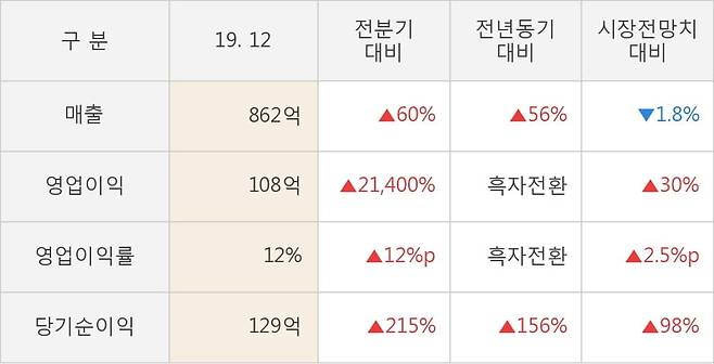 매출액은 862억원으로 전년 동기 대비 56% 증가했고, 영업이익은 108억원으로 전년 동기 대비 크게 증가했다.