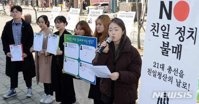 [전주=뉴시스] 김얼 기자= 전북겨례하나 관계자들은 14일 전북 전주시 전북대학교 구 정문 앞에서 '투표는 처음이라' 친일정치 불매 캠페인을 열고 선언문을 낭독하고 있다. 2020.02.14.