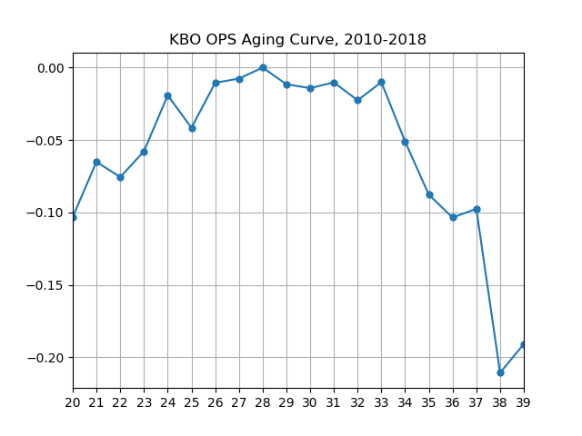 위 결과에 의하면, 타자들의 전성기는 만 28~29세이다. 28살까지 타자의 OPS는 꾸준히 증가하고, 그 이후부터는 감소한다.