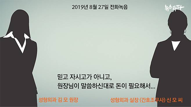 (신 씨) 원장님이 말씀하신대로 돈이 필요해서...아빠 쓰러지시고 엄마 수술하셔야하고, 저도 힘들다고 몇번 말씀드렸는데, 집안 분위기가 좋지 않아요. - A성형외과 원장 김OO 씨와 실장(간호조무사) 신OO 씨 대화(2019.8.27)