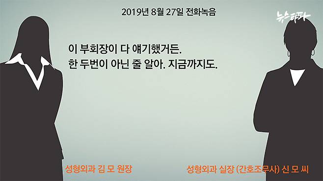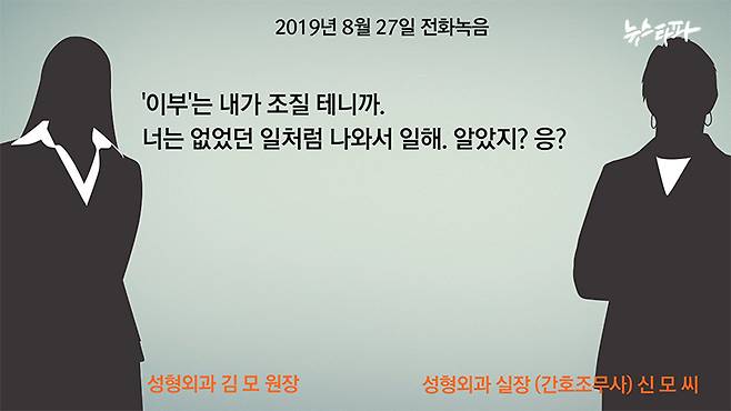 (김 원장) 이 부회장이 다 얘기했거든. 한 두번이 아닌 줄 알아, 지금까지. 그런 거 저런 거 다 덮을 테니까 앞으로 그러지 말라고, 응? 네가 나한테 미안함이 조금이라도 있다면 나와서 열심히 일해. ‘이부’ 문제는 내가 알아서 할 테니까. 근데 약은 안 돼. 아주 가서 하는 건 안 돼. 알았어? 어쨌든 니 탓도 있고 ‘이부’ 탓도 있으니까… ‘이부’는 내가 조질 테니까, 너는 없었던 일처럼 나와서 일해, 알았지? - A성형외과 원장 김OO 씨와 실장(간호조무사) 신OO 씨 대화(2019.8.27)