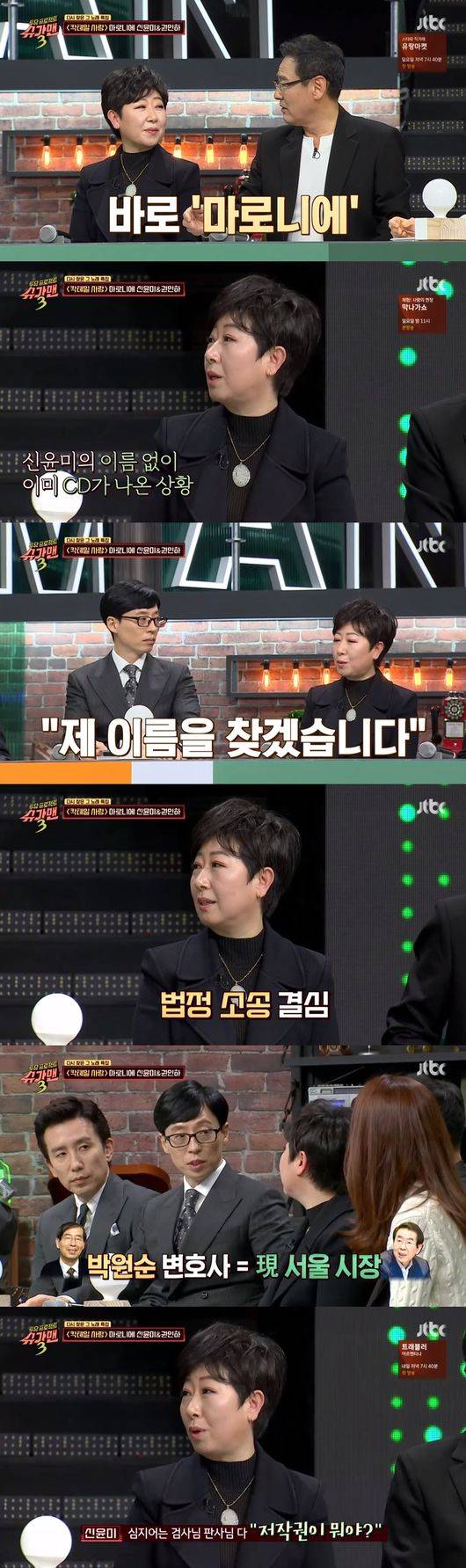 신윤미는 "그래서 내 이름을 찾기 위해 소송을 진행했다. 당시 저작권을 다루는 변호사가 없었다. 그때 지금 서울 시장인 박원순 변호사가 인권 변호사님이었다. 판사, 검사도 대체 저작권이 뭐냐고 했다"라고 말했다.