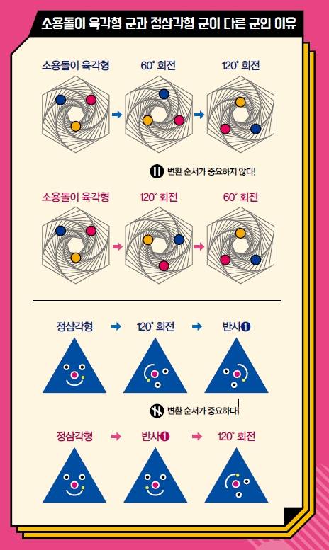 이처럼 정삼각형 군과 소용돌이 육각형 군은 다른 대칭을 가지고 있습니다. 이런 여러 구조가 가진 대칭의 성질을 문자와 기호를 통해 수학의 언어로 표현해 연구하는 것이 군론입니다.