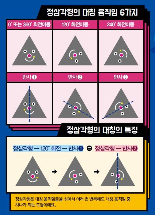 수학에서 정삼각형을 대칭 도형이라고 하는 이유는 정삼각형을 시계방향으로 120° 회전해도, 축을 기준으로 반사(거울 대칭)해도 똑같은 모양이기 때문입니다. 그러니 정삼각형의 진짜 대칭은 모양뿐 아니라 회전, 반사와 같은 ‘움직임’입니다.
